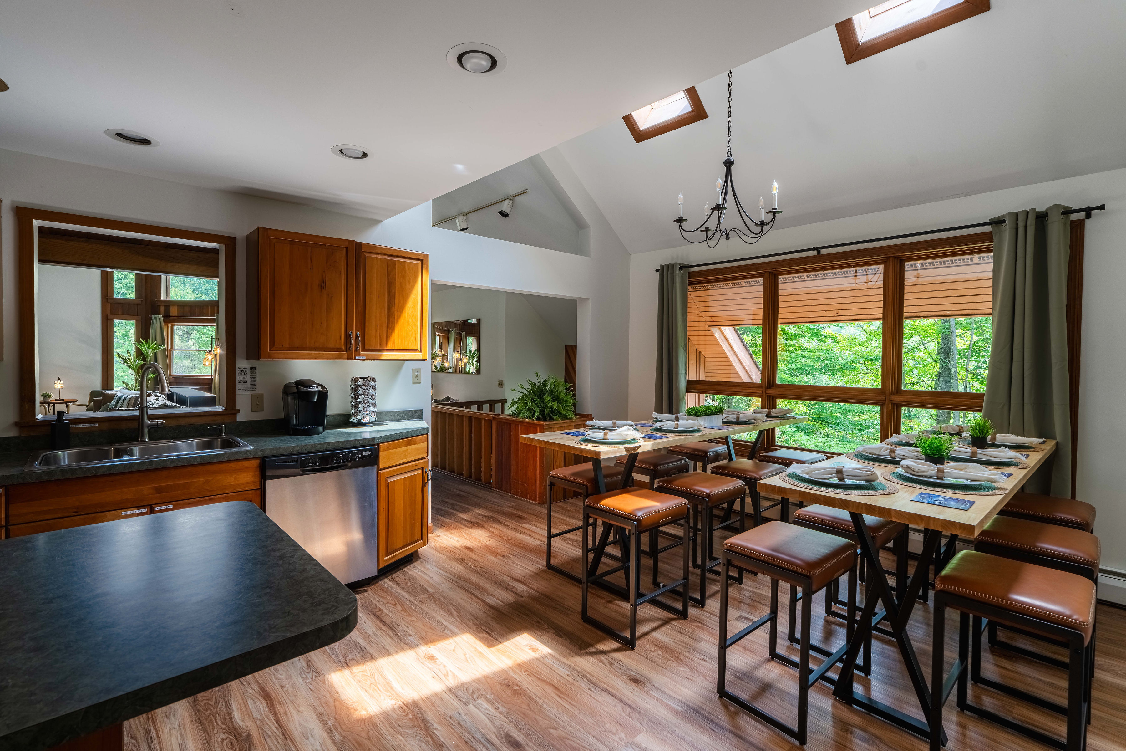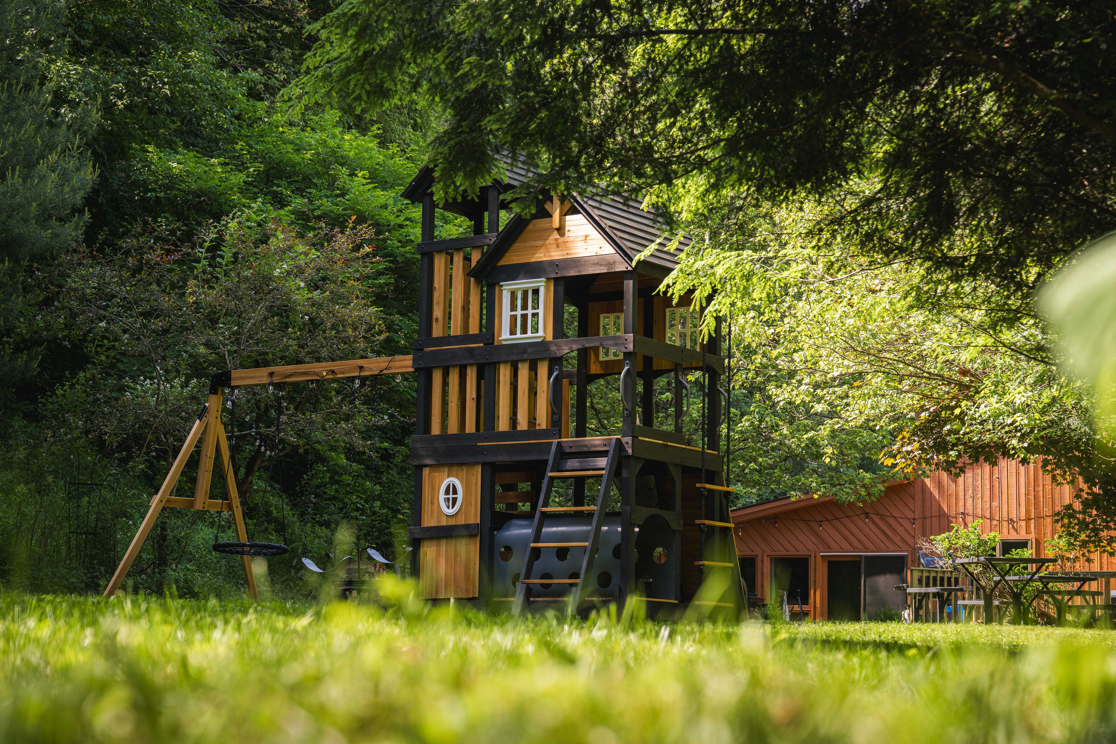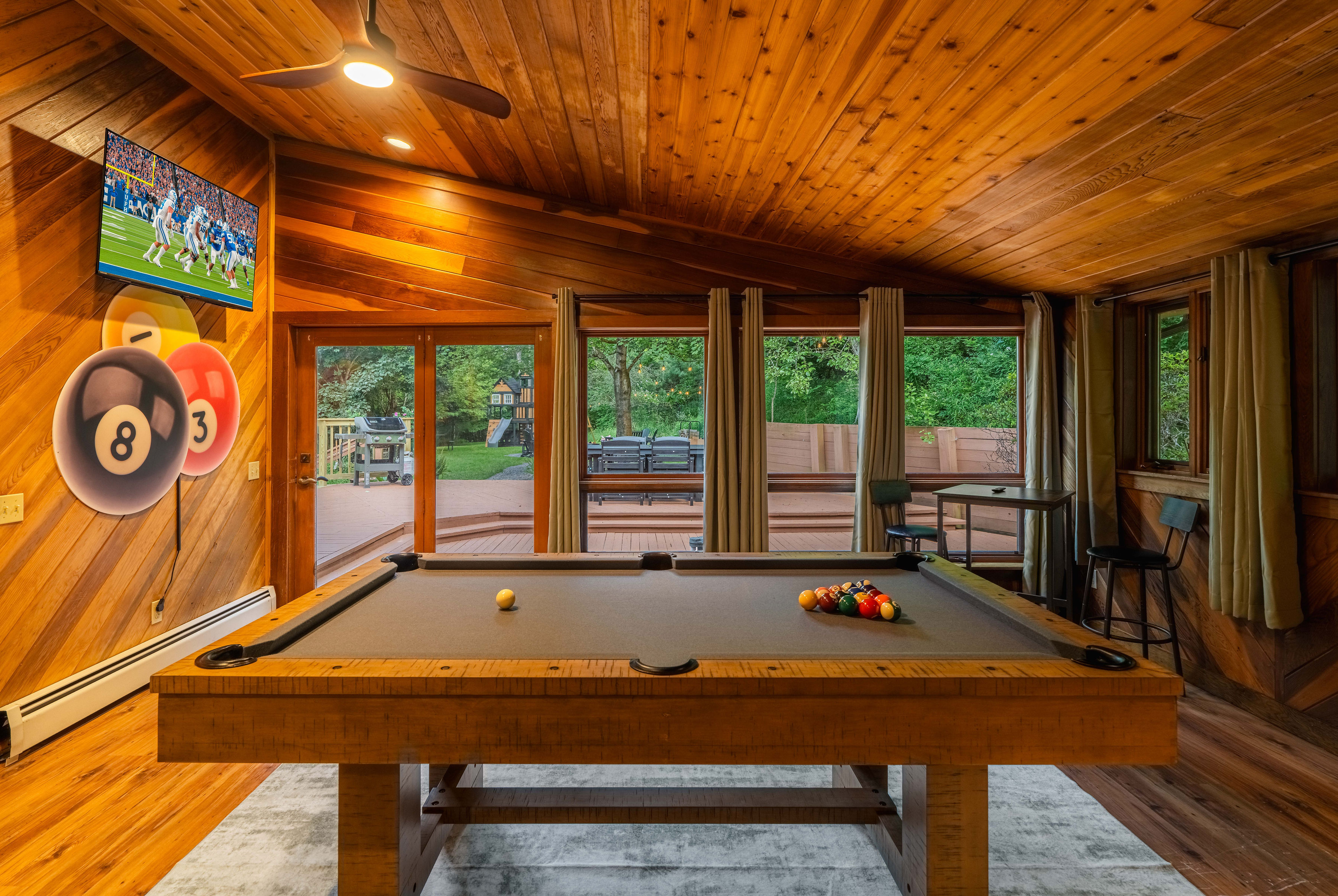 Multi-level decks, outdoor dining, and forest views in every direction.