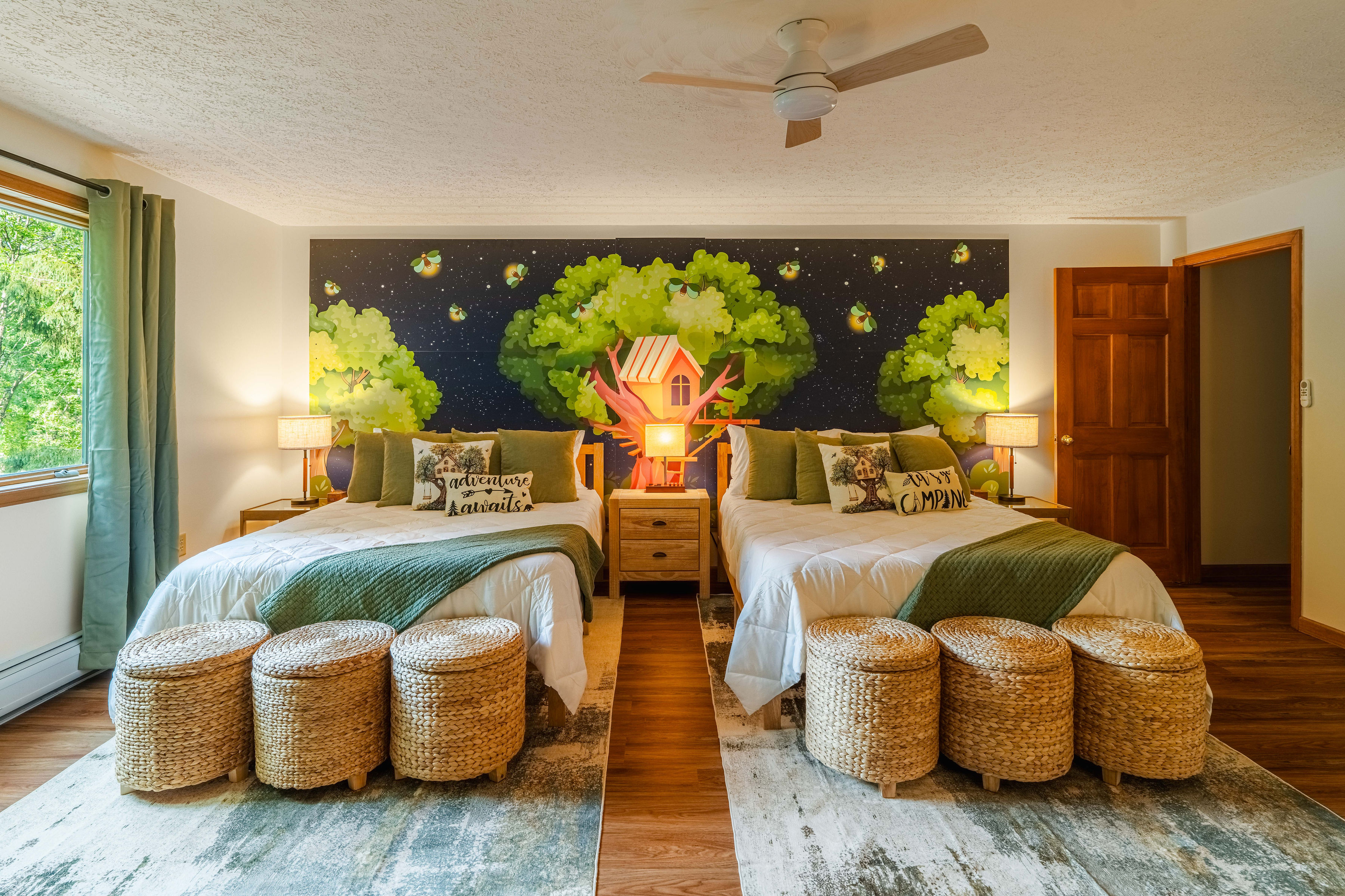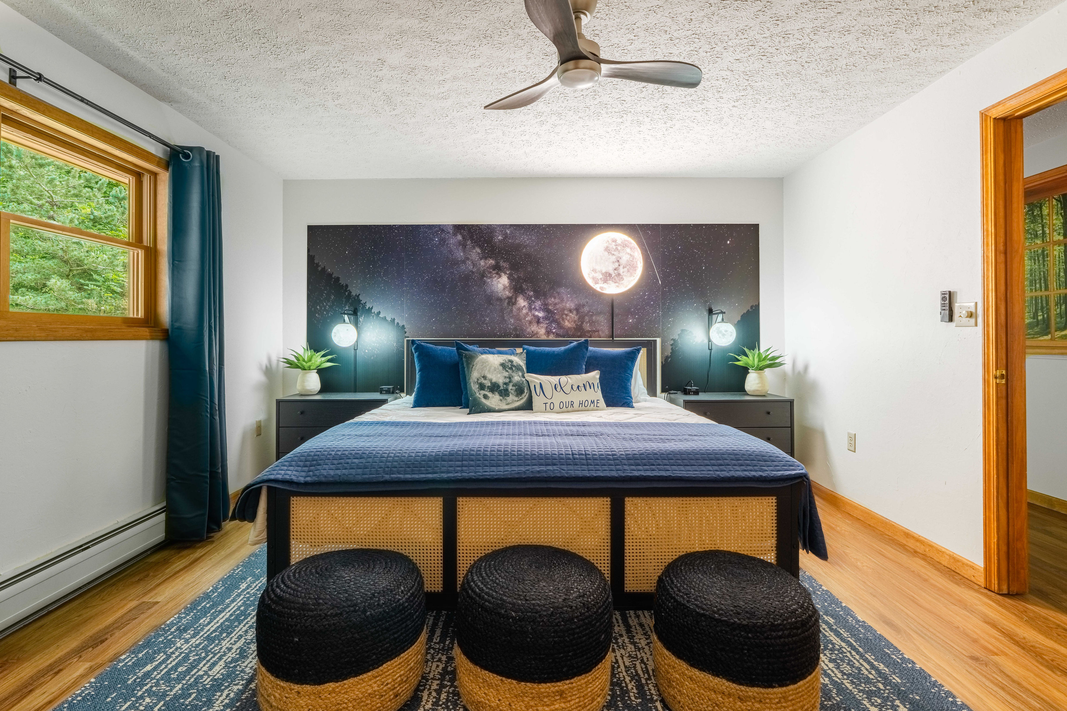 Galaxy Room (upstairs): Queen over Queen Bunk + Two Twins